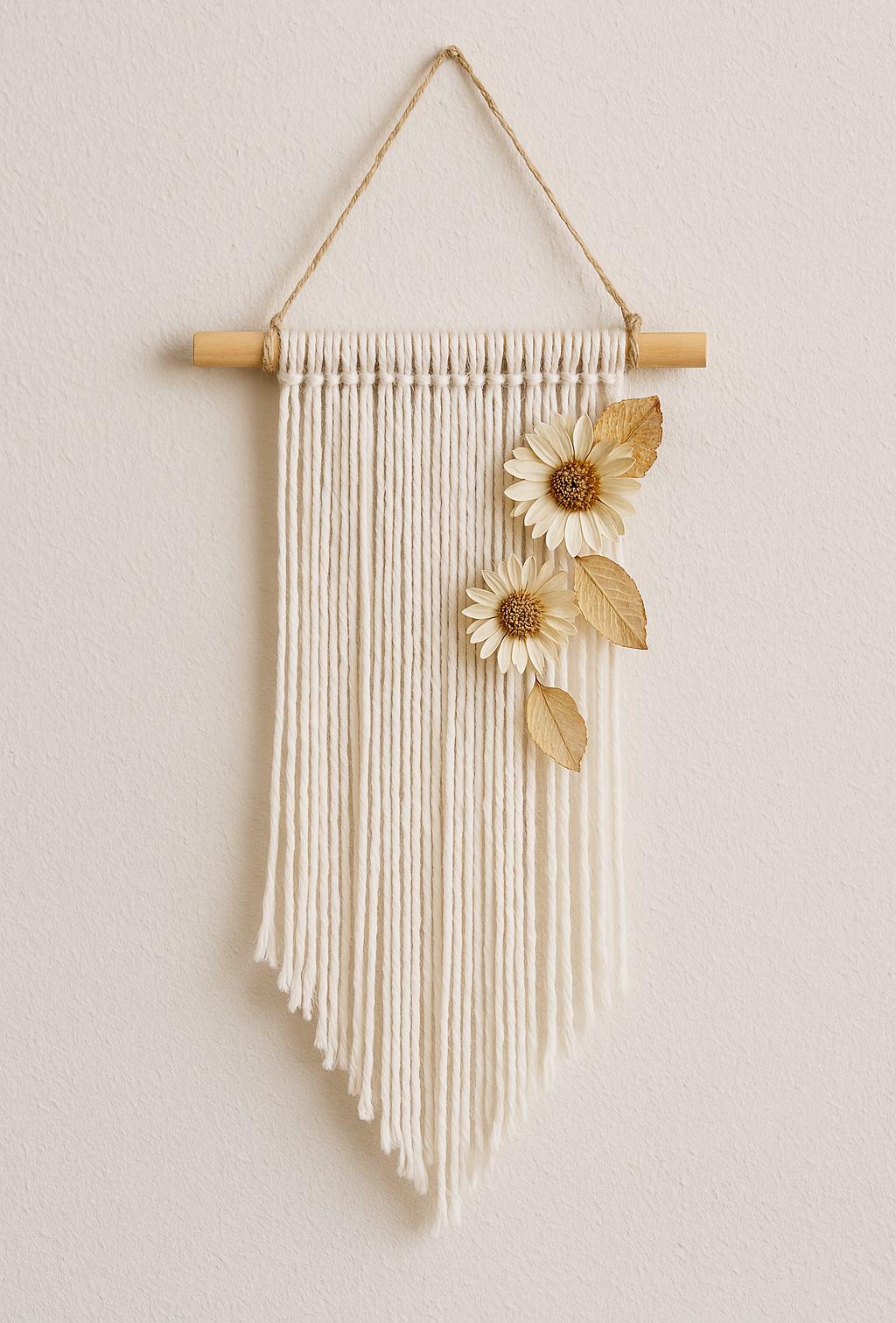 - Use the added pieces to attach and incorporate beads, feathers or dried flowers to the hanging pieces to use as additional decorative pieces.
